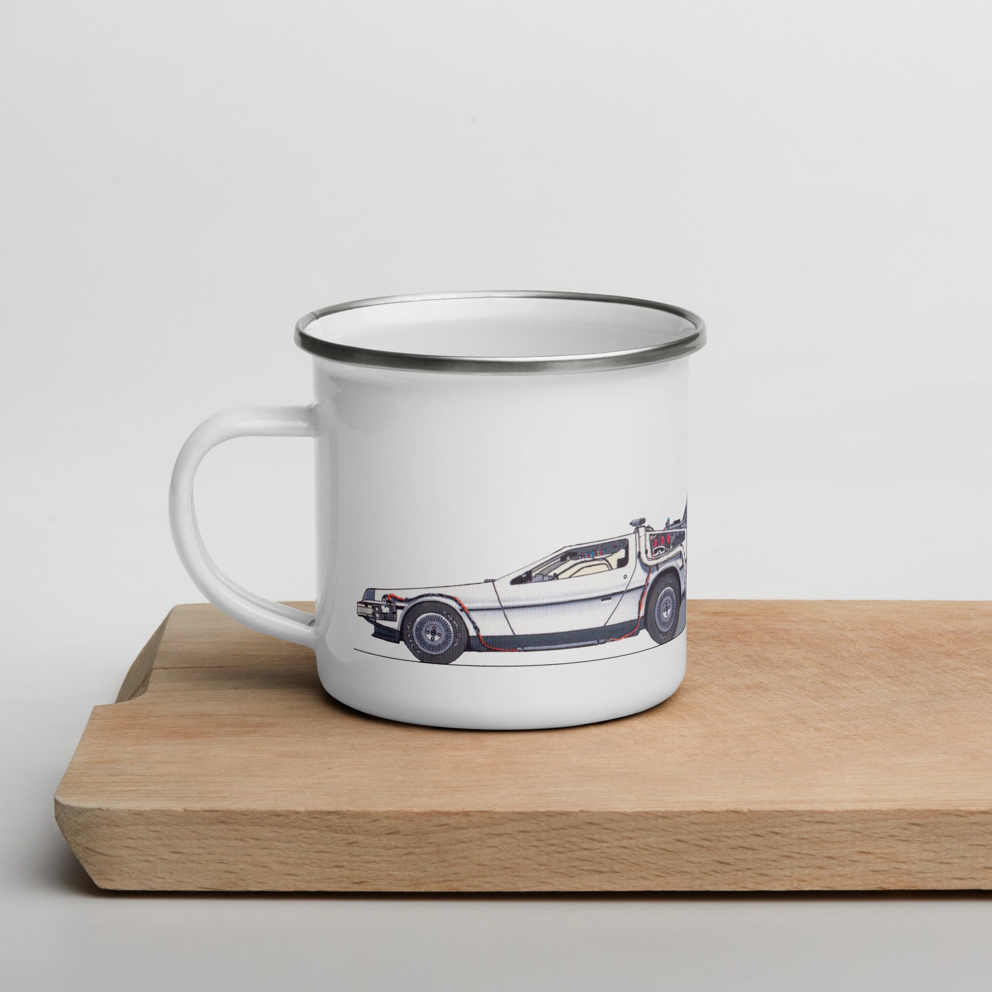 An enamel mug featuring original artwork of the DMC DeLorean Time Machine from Back to the Future.