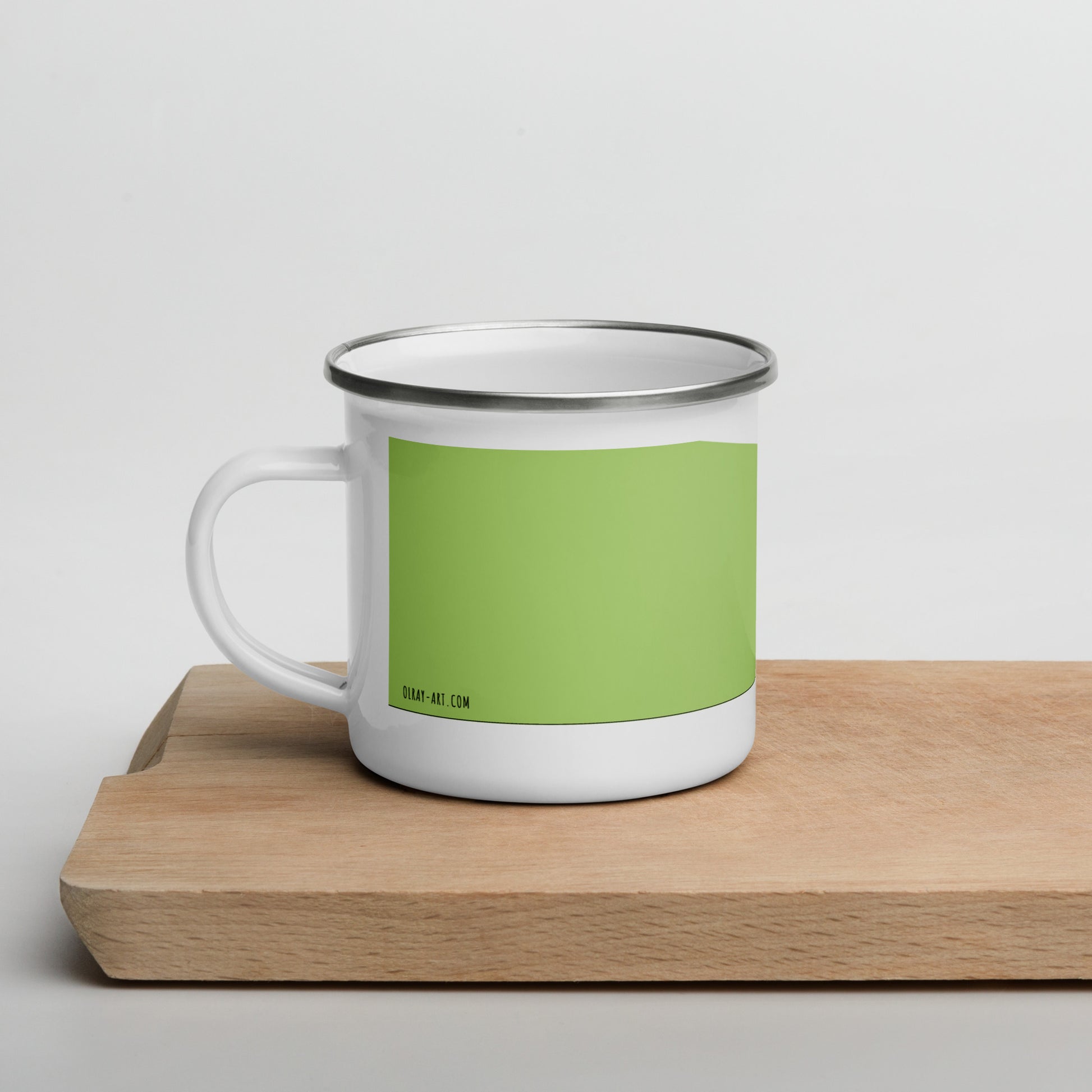An enamel mug featuring original artwork of a Land Rover Mk1.