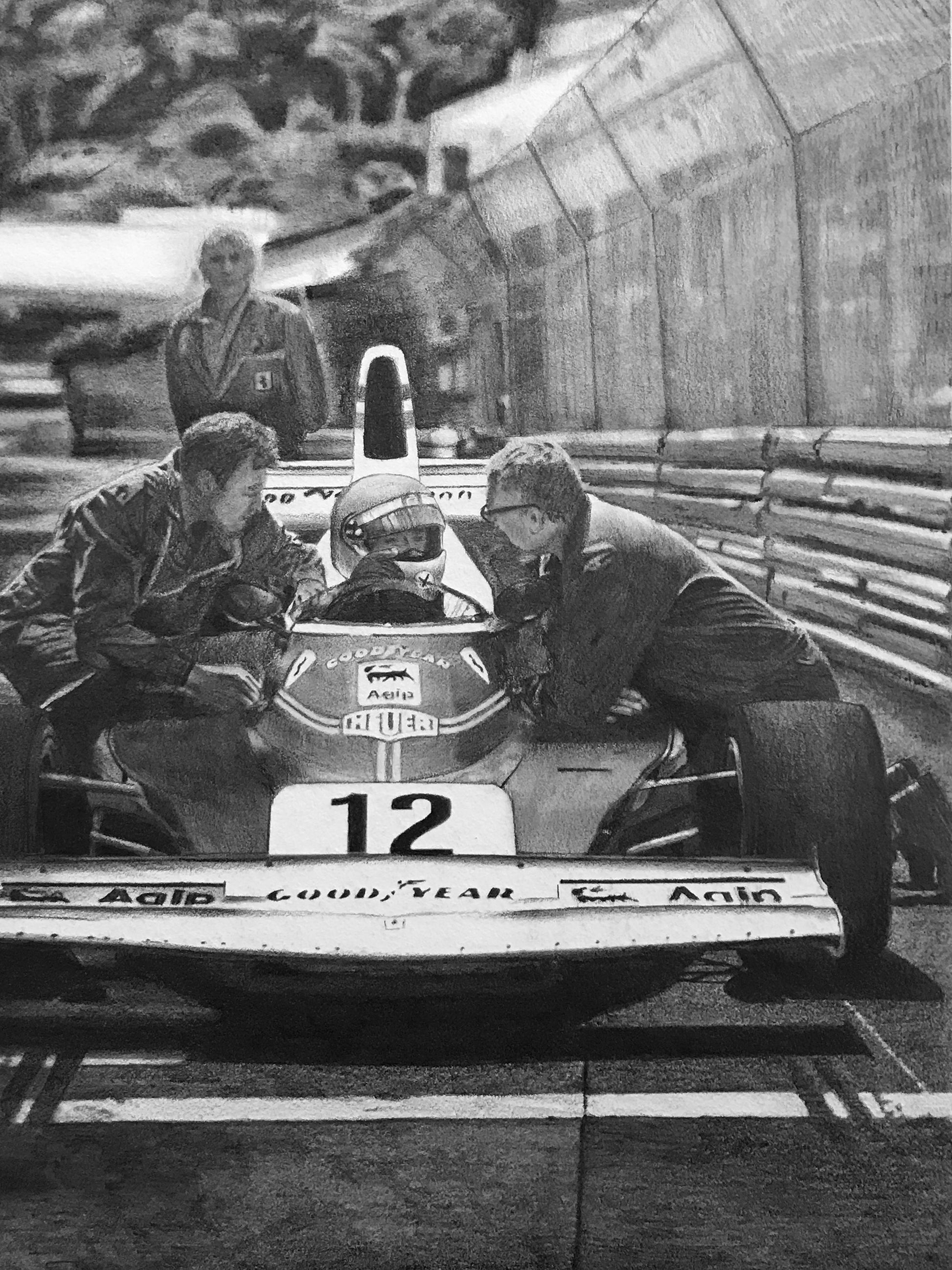 'Calm before the storm' Niki Lauda talking to engineers on the grid of the 1975 Monaco Grand Prix.