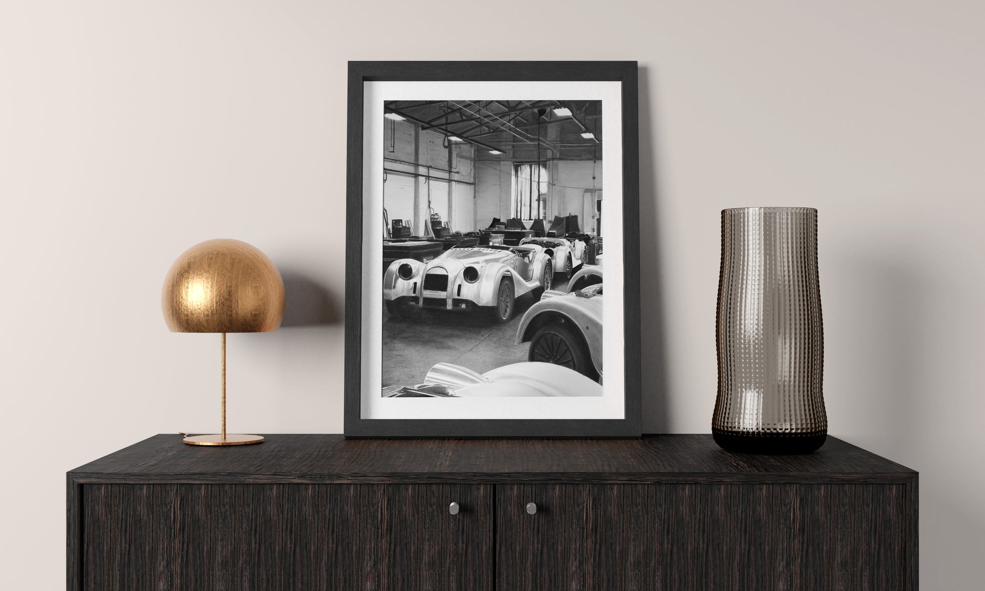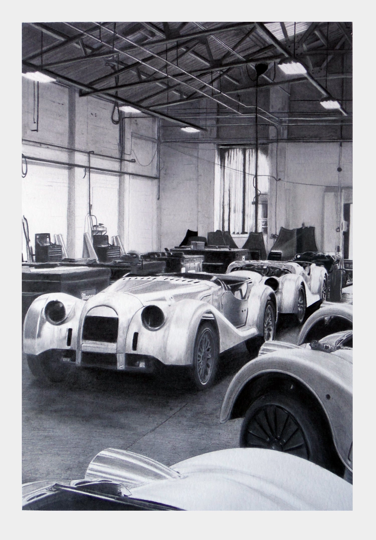 Pencil and coloured charcoal drawing, depicting the workshop production line of the Morgan Motor Company. The drawing is on 360gsm English textured paper, dimension 297mm x 420mm (A3).